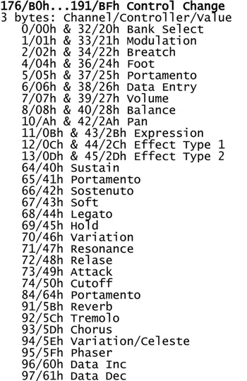 Przypomnę to, o czym pisałem w pierwszym artykule serii o MIDI: komunikaty związane z owymi nastawami zaczynają się bajtem o wartości od 176 do 191 – określającym ten właśnie typ komunikatu, zwany Control Change i numer kanału midi. Następnie mamy drugi bajt – mówiący co chcemy zmienić i trzeci, zawierający wartość zmienianą. Spójrzmy w tabelę: numer jeden na przykład to modulacja.