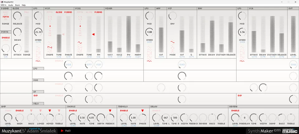 Tutaj nieskromnie pochwalę się własną produkcją, Muzykantem S3, który powstał już jakoś dwanaście lat temu w aplikacji SynthMaker. Jest to wspaniałe środowisko do budowy wirtualnych instrumentów, w którym możemy zrobić wszystko po swojemu – od struktury instrumentu, po grafikę. Ta odsłona udaje syntezatory z przełomu lat 70/80 i zawiera kilkadziesiąt nastaw. Te wszystkie, przy których znajdziemy niebieskie napisy, można regulować zdalnie za pomocą takiego na przykład urządzenia, jakie właśnie stworzyliśmy. Jeszcze słowo wyjaśnienia: w jaki sposób za pomocą MIDI dostać się do takiego istniejącego tylko w komputerze syntezatora? Potrzebny jest interfejs MIDI.