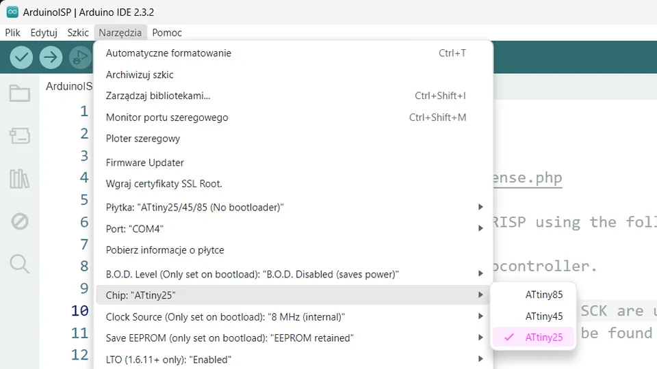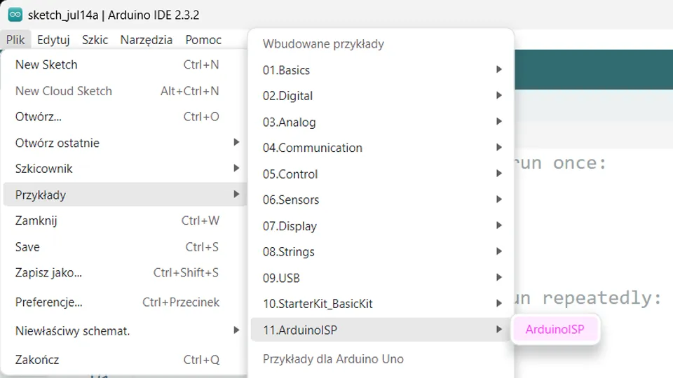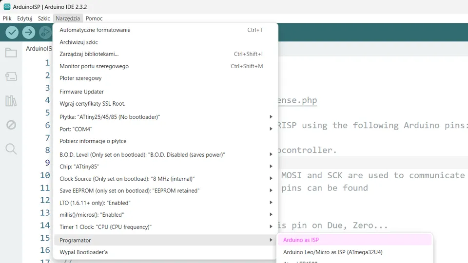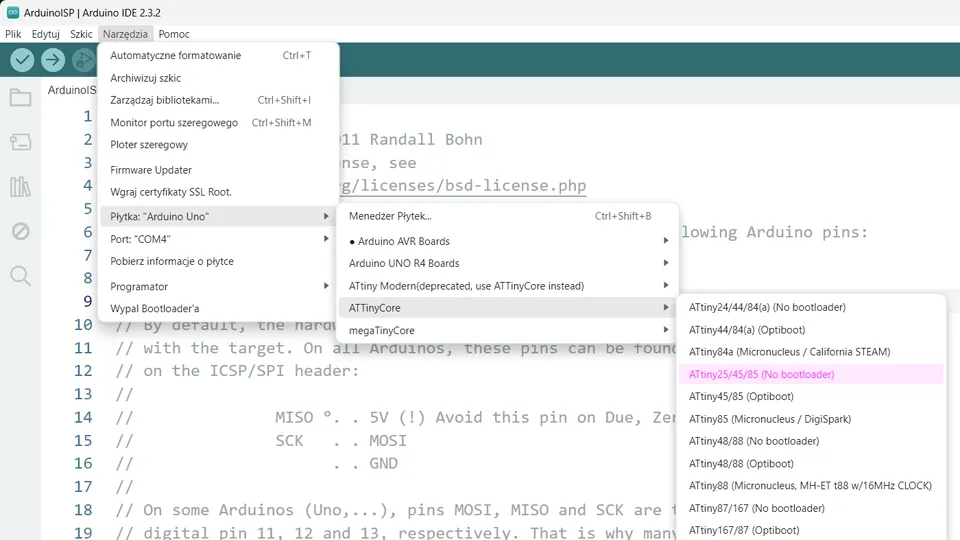 Gdy przejdziemy ten etap, trzeba będzie z naszego Uno zrobić programator. Odpowiedzialny za to szkic odnajdziemy w przykładach jako ArduinoISP. Należy nim zwyczajnie zaprogramować Uno, jak się to robi z każdym innym szkicem. Teraz będziemy musieli kolejno: