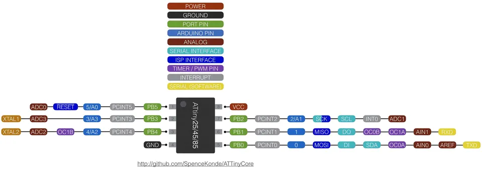 O tej i wielu innych rodzinach, nie do końca oficjalnie wspieranych, pisałem jakiś czas temu w artykule poświęconym kostkom współpracującym z Arduino. Przypomnę więc założenia: nie są one w stu procentach kompatybilne, a raczej mają takie czy inne braki. Rzeczony bohater na przykład ma tylko sześć pinów, które mogą stać się portami do wyboru z dość dużego zbioru możliwości. Posiada 2 kB pamięci FLASH i 128 bajtów RAM-u, więc wydaje się zupełnie nieatrakcyjny. Pozory mylą. Najpierw jednak przypomnijmy sobie, w jaki sposób z tej małej biednej kostki można zrobić Arduino. Szczegóły podawałem w wymienionych artykułach, więc dziś przypomnę tylko szybciutko.