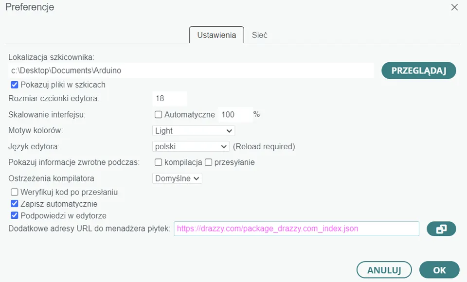 Uruchamiamy Arduino IDE i w preferencjach dodajemy widoczny tu adres do narzędzi, które umożliwią nam stworzenie programatora z Uno.