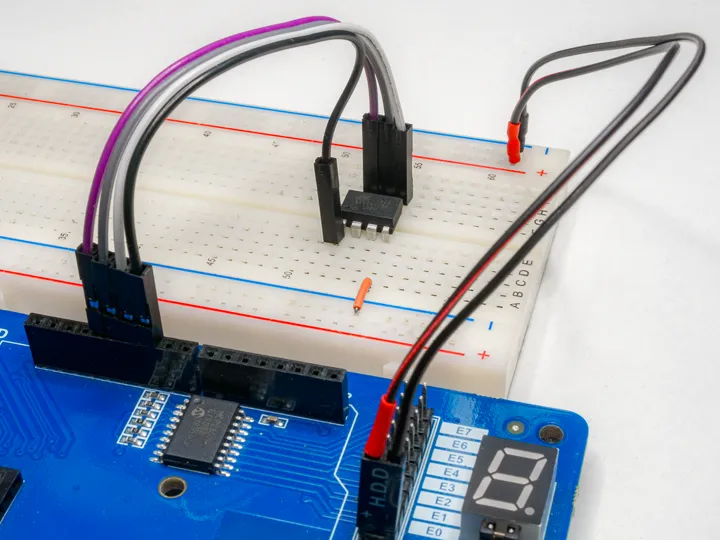 Do programowania układu Tiny użyję dużego Arduino, czyli wersji Uno, która tym razem nie będzie elementem docelowym, a tylko sprytnym interfejsem - programatorem. Wykorzystam płytkę edukacyjną TME, ponieważ mam tu wygodny dostęp do portów. Na płytce uniwersalnej osadzam mały mikrokontroler w sposób tu widoczny, czyli: port 10 – nóżka pierwsza, 11 – piąta, 12 – szósta i 13 – siódma. Nóżka 8 to zasilanie, a czwarta – masa. Potrzeba będzie więc sześciu przewodów i niczego więcej.