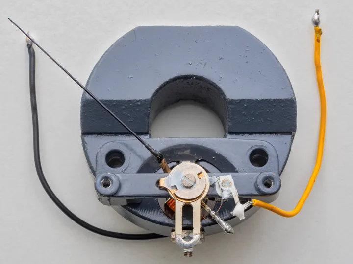 Bohaterem najbliższych artykułów będzie miernik magnetoelektryczny tablicowo-aparatowy, jak niesie opis, z warszawskiej Mery. Nie jest to urządzenie samodzielne, ponieważ z tyłu posiada otwarte złącza śrubowe. Zostało zaprojektowane do wbudowania w różnego rodzaje panele złożonych urządzeń i ma za zadanie pokazywanie wybranej wielkości elektrycznej z dokładnością dwu i pół procentową. Ustrój magnetoelektryczny oznacza, iż wskazówka odchyla się od domyślnej pozycji stabilizowanej sprężynami – takimi jak w zegarku – za pomocą pola magnetycznego wytwarzanego przez cewkę, która znajduje się w polu magnetycznym magnesów trwałych. Czasem jest na odwrót, odchyla się magnes, a cewka jest nieruchoma, ale nie tu.